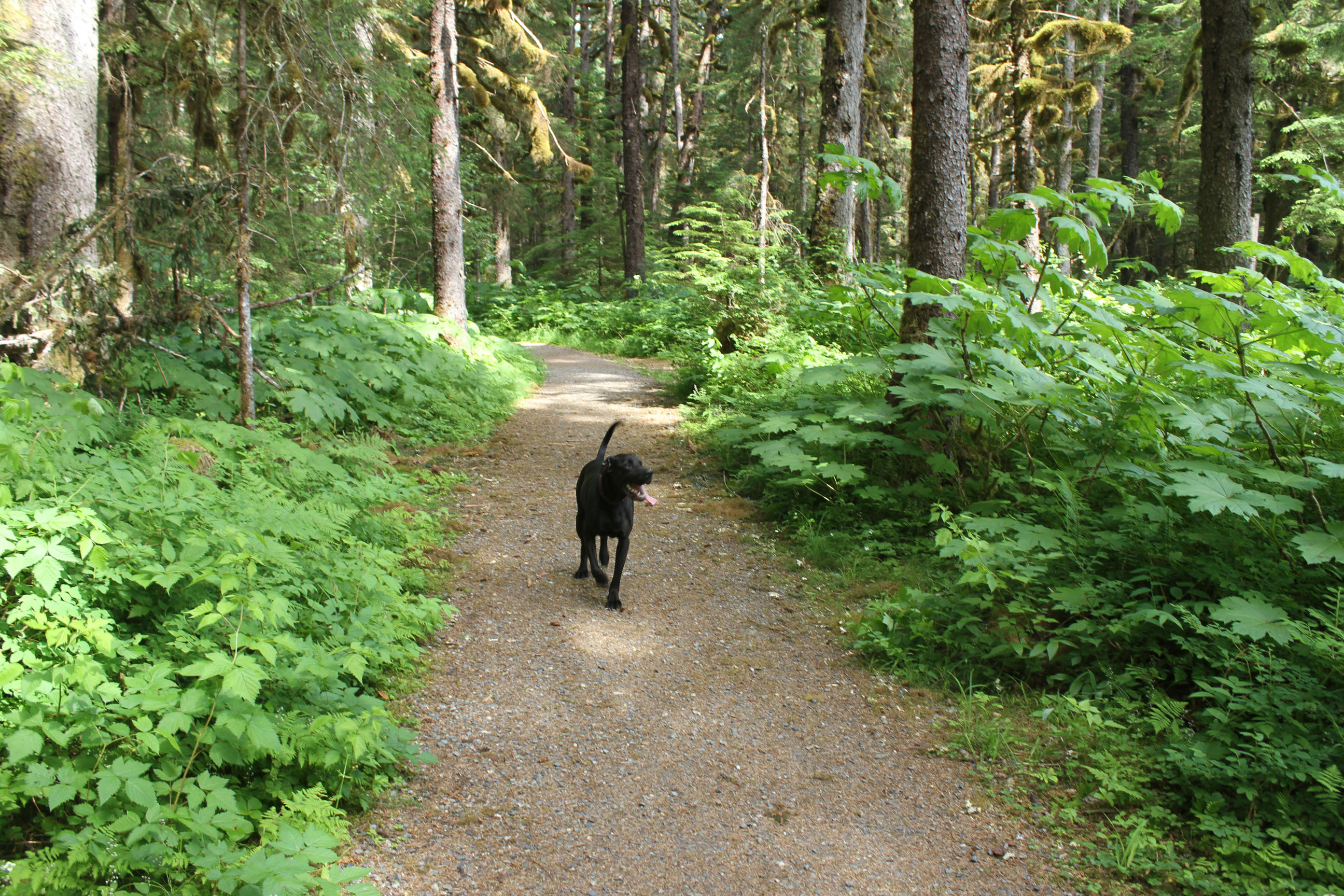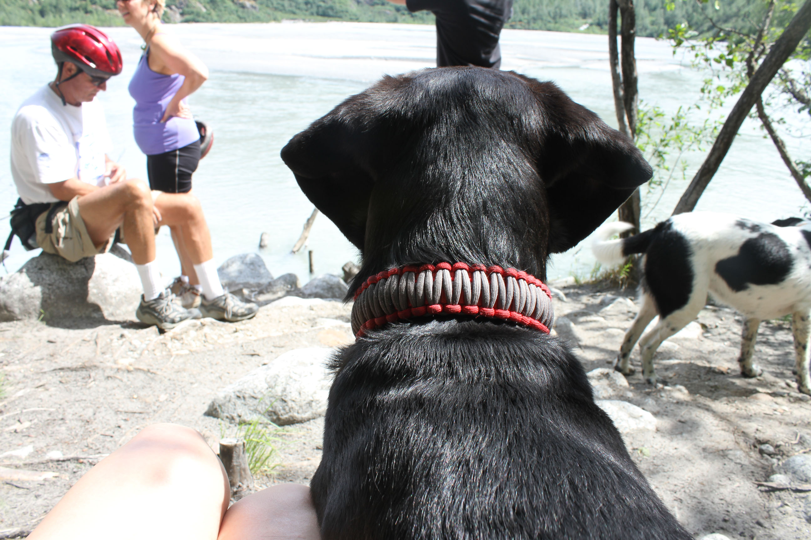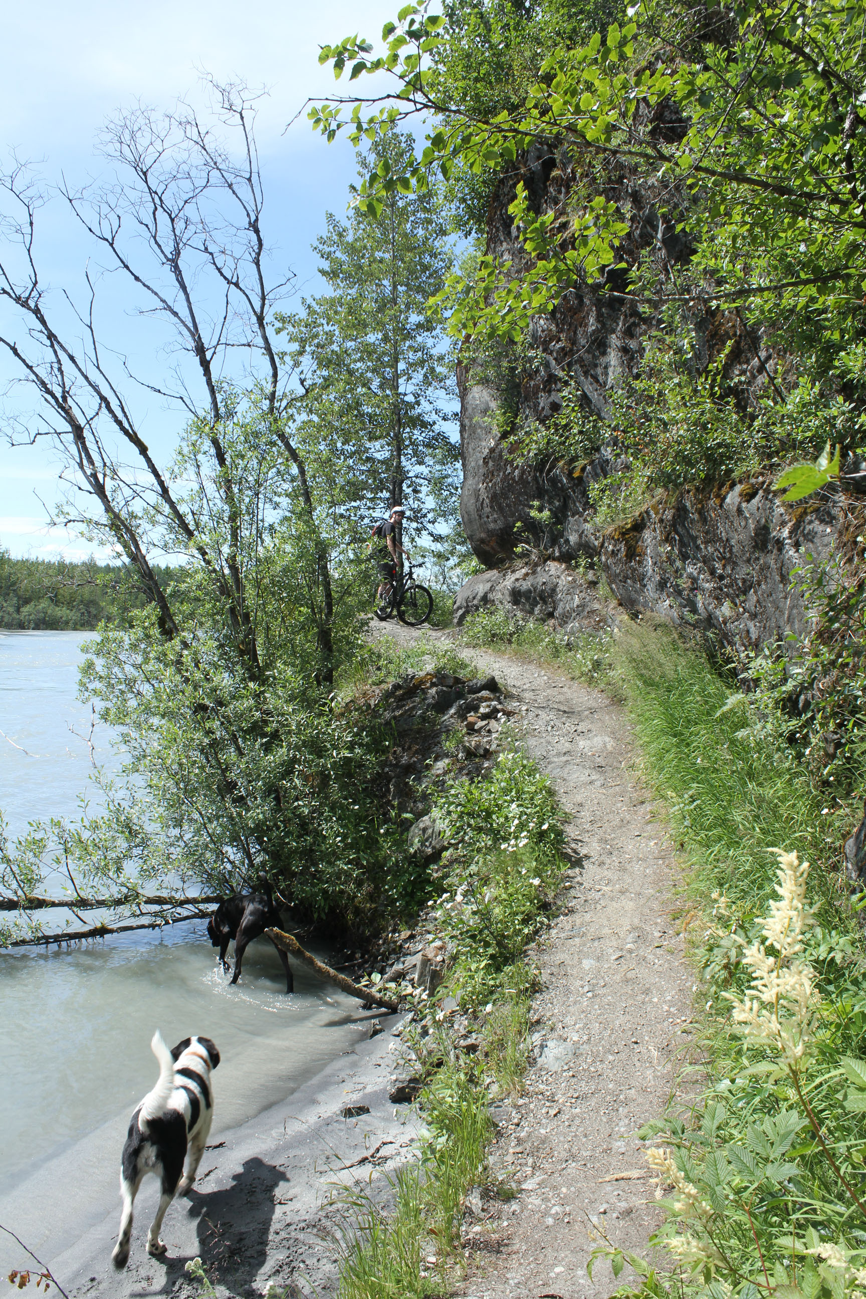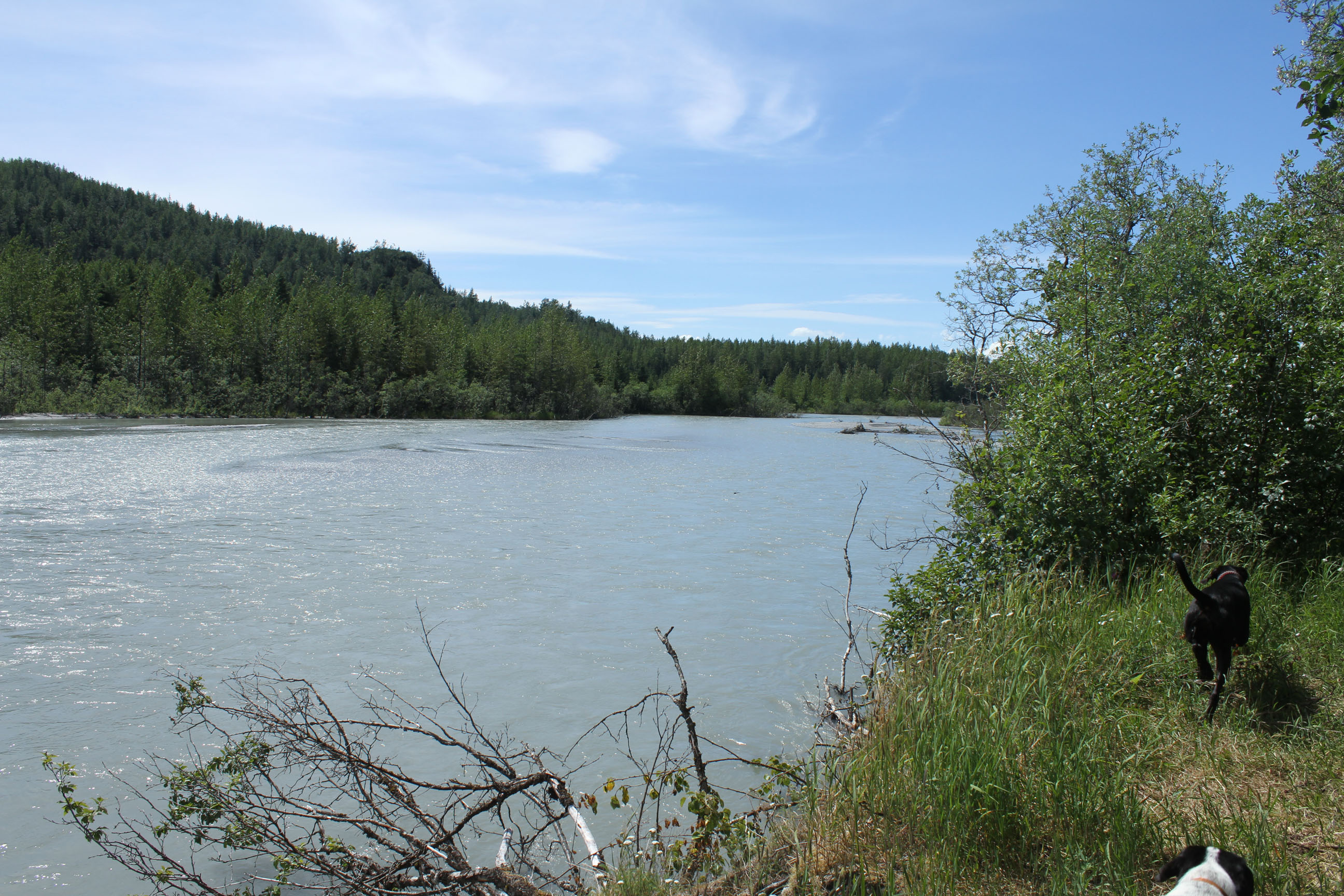 The trail was super awesome today! Even though it was a grueling 70 out, the trees provide some shade along the trial. It wasn’t windy out, so the bugs were a little obnoxious when we stopped. At the alluvial fan where the river runs by the trail, it was a little more buggy. But it was hilarious to watch Kiska try to catch the flies that were landing on her. Doc didn’t seem to mind and just leaned in for more head rubs.