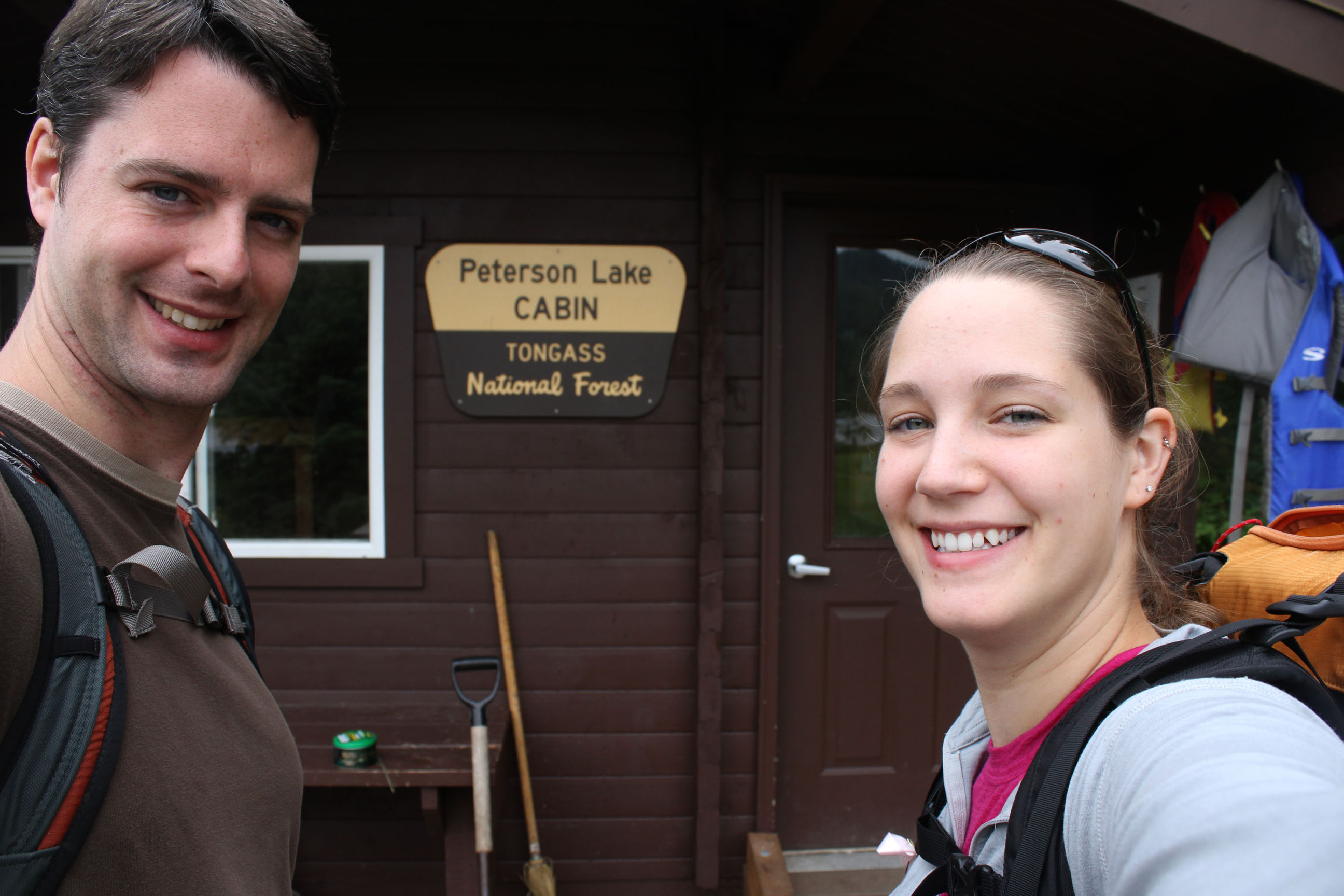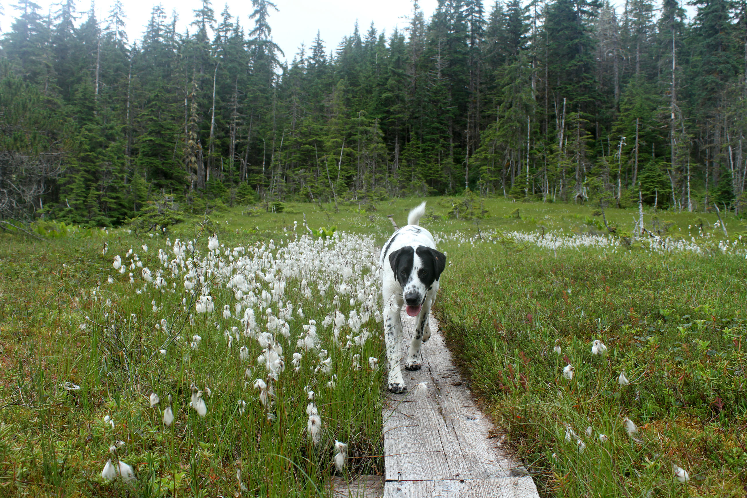 The cabin at the end is on a beautiful lake. There is a boat tied to the dock, and they even have some life jackets hanging at the cabin. The outhouse is pretty nice, but I still prefer to pee behind it. Outhouses just creep me out. And, the last time I was there, Kiska managed to pull the door open, came in, smelled me, then walked out – WITH THE DOOR WIDE OPEN! What a brat.
