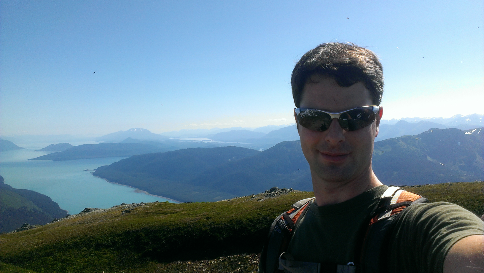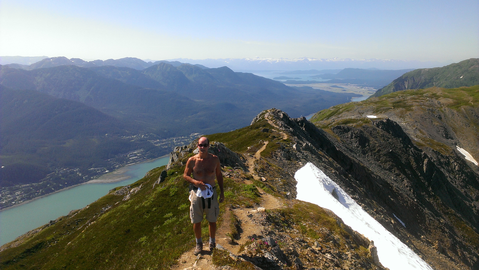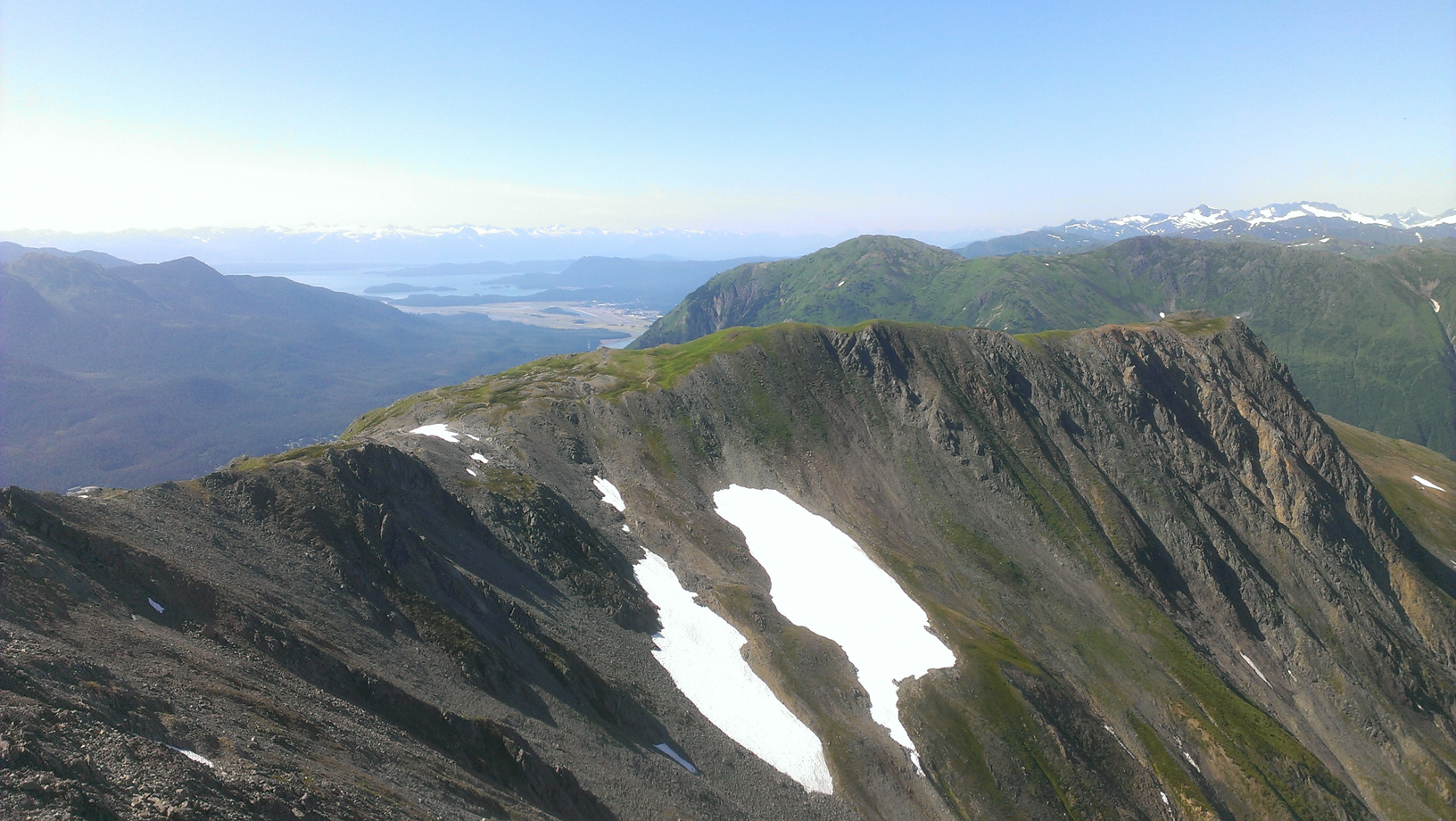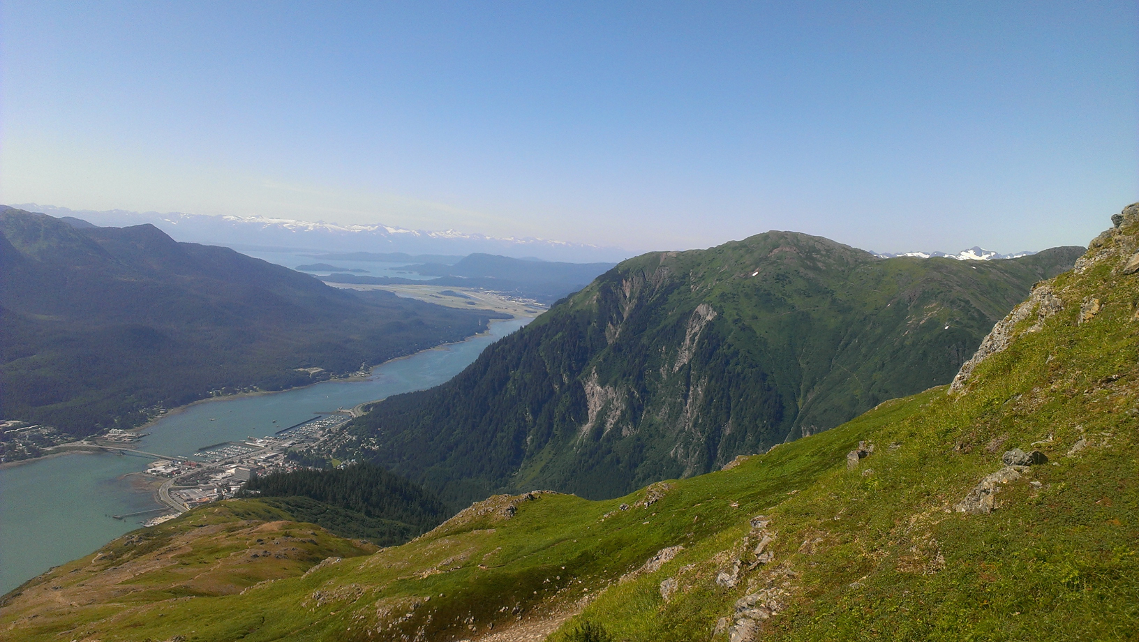 From the top you can see quite a ways. Douglas Island, downtown, and into the valley. Even south down the channel quite a ways.