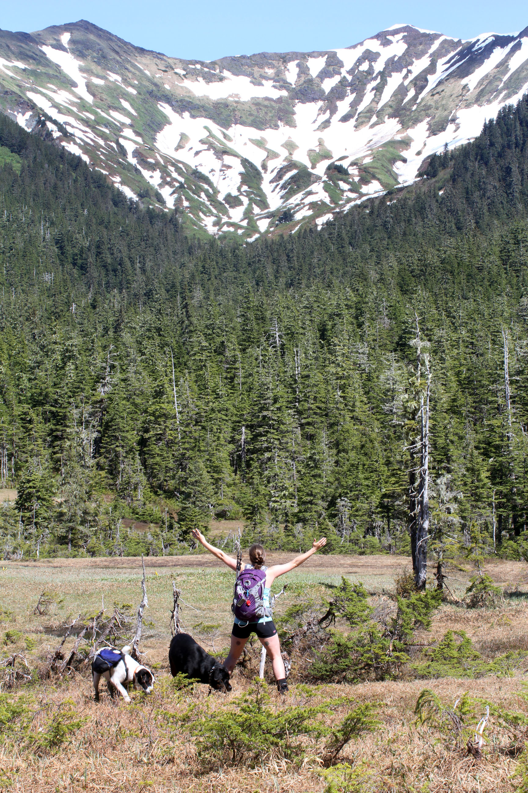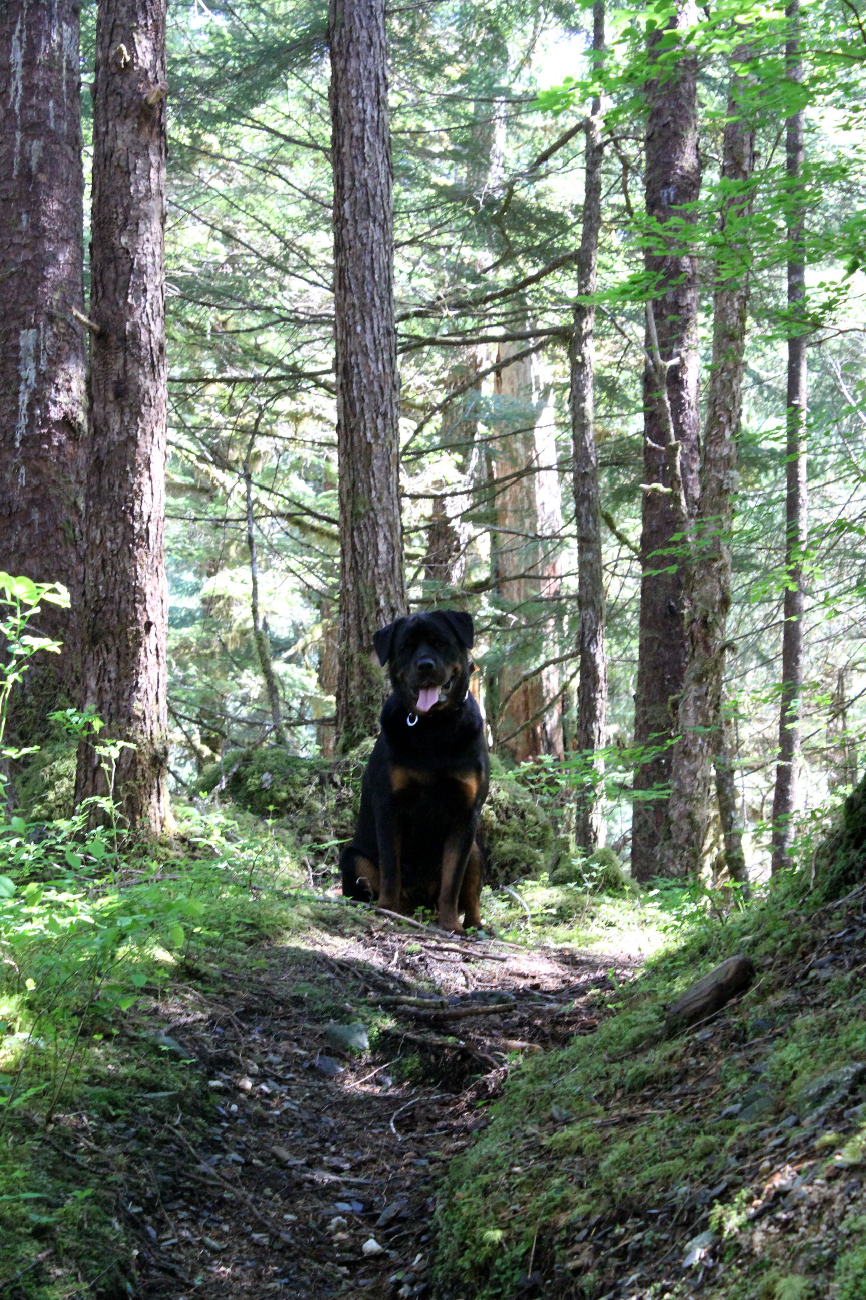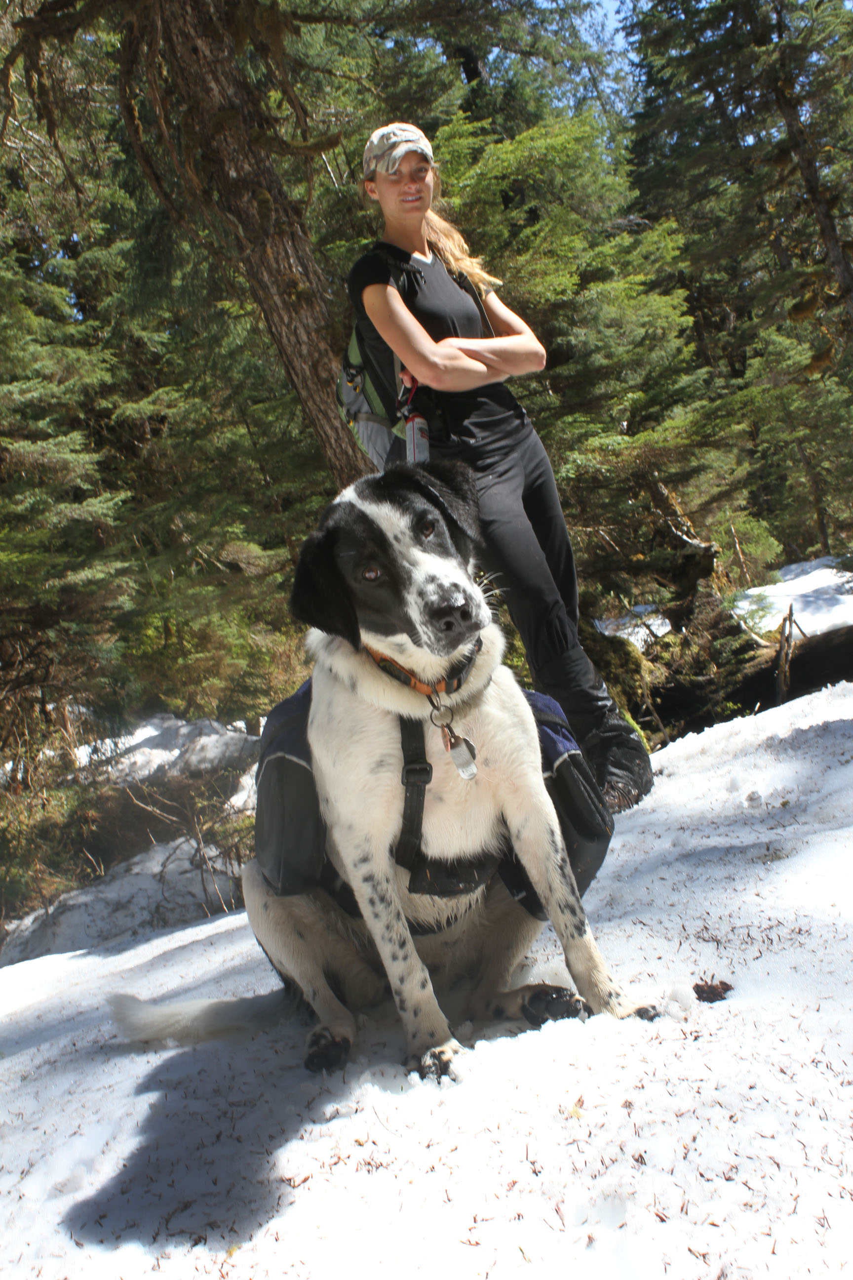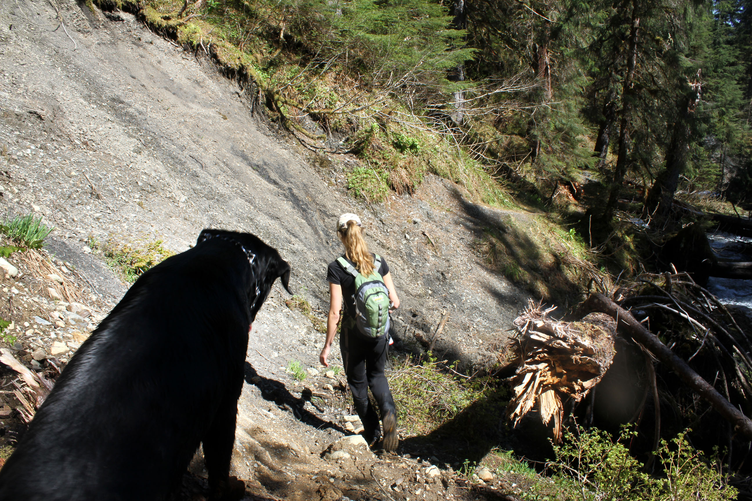 After the snow slowed us down and we were dropping in elevation, we meandered along the river for the rest of the way to Montana Creek. Well, maybe ‘meander’ is the wrong word. We skirted the steep hillside on the small goat trial and at one point we actually had to forge the river because the trees had fallen down the hillside and taken the land and trail with it. We had a 2 year old Rottweiler, an 8 year old Rottweiler / Akita, and Kiska. We didn’t feel that we could safely get across the trail ourselves, let along with the dogs. So we backtracked a little ways, and forged the river in a safe-er spot (no spot was really ‘safe’). For me, it was up to my butt cheeks, but luckily I was wearing my Under Armor shorts (they are kind of glorified underwear), so they didn’t get wet and my legs dried pretty quickly. But our boots were full of water.