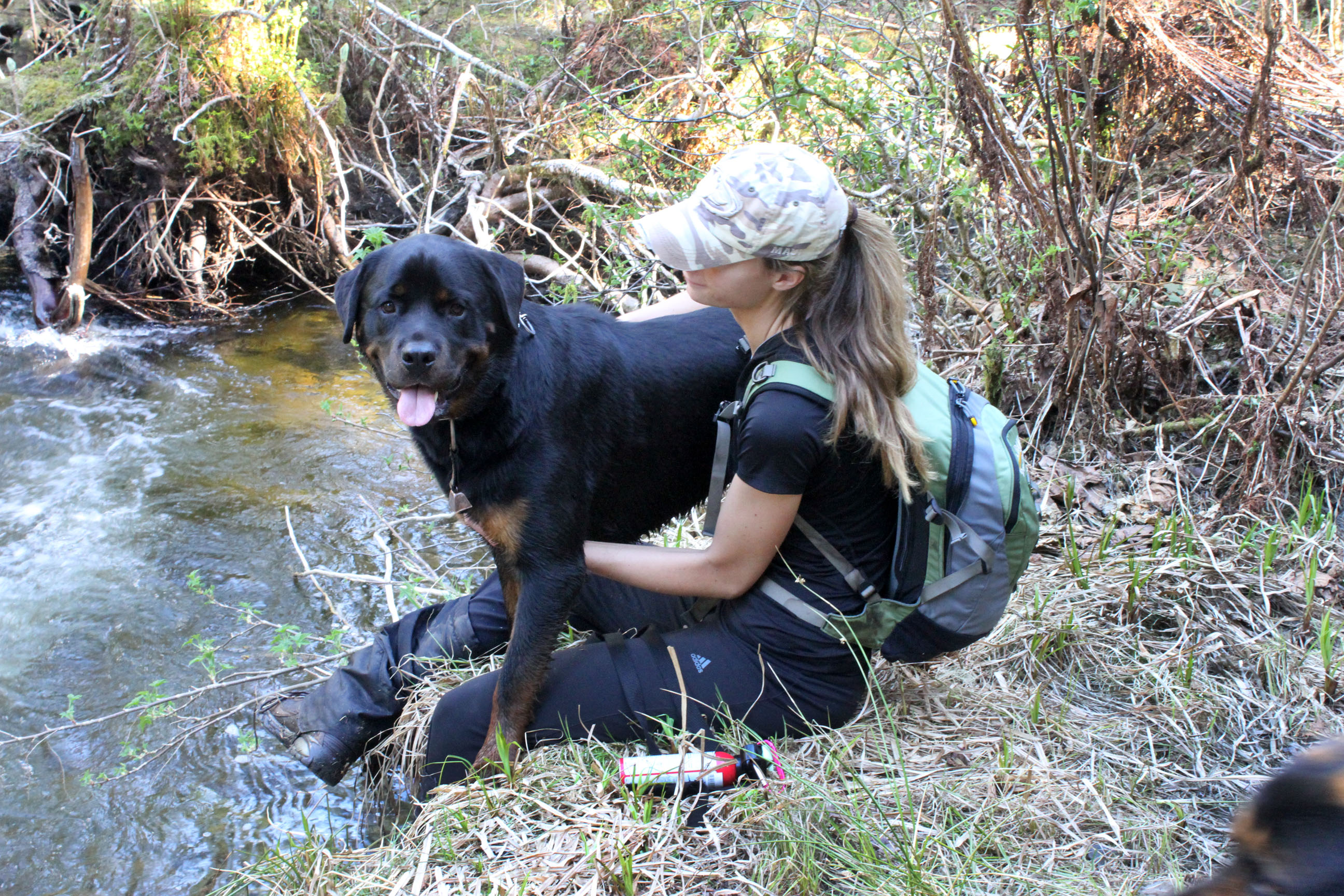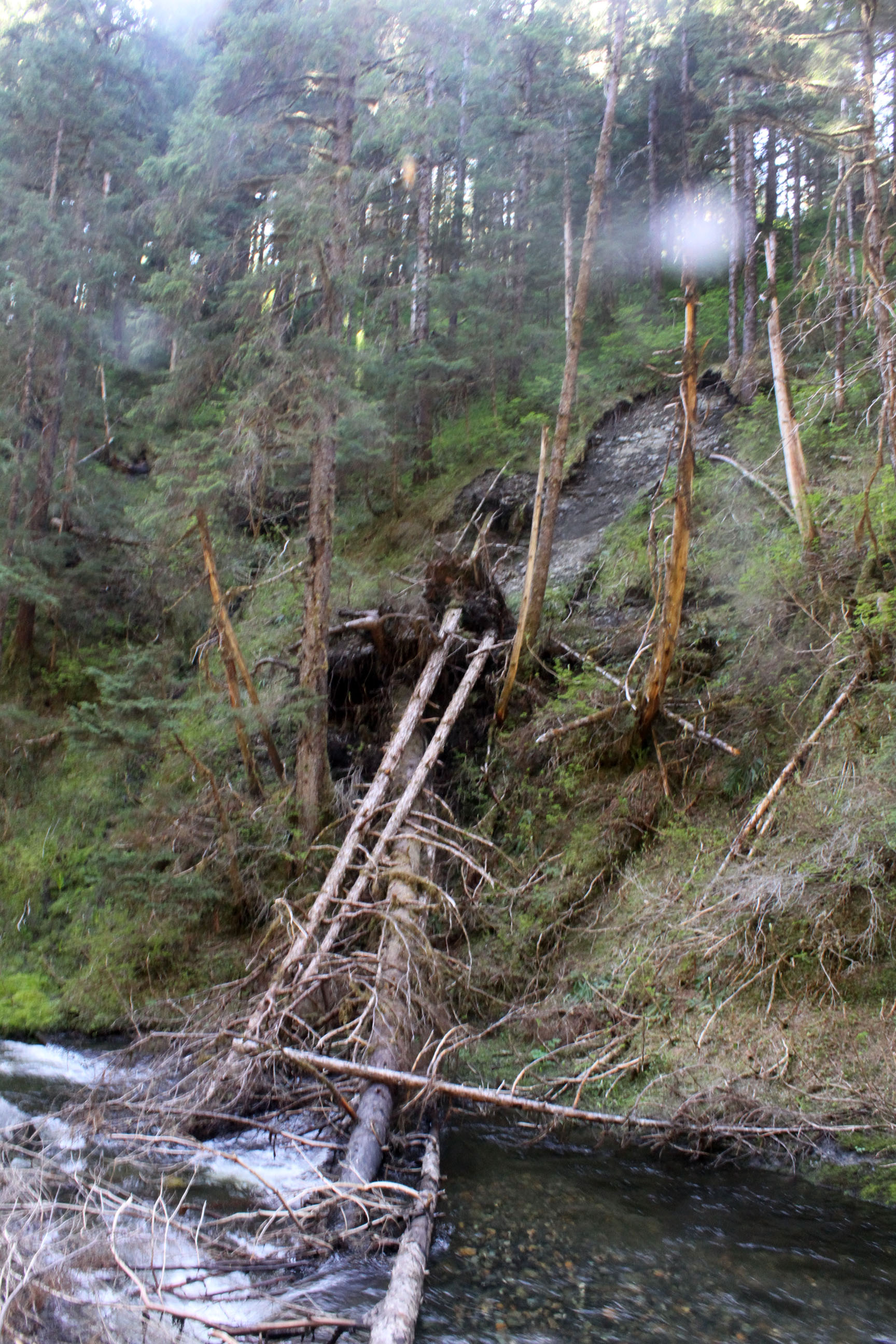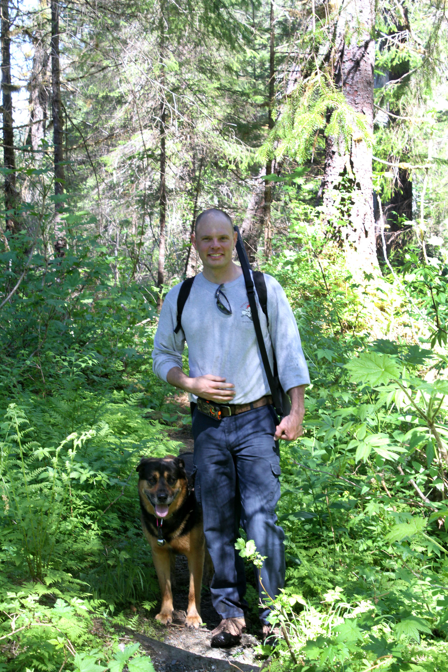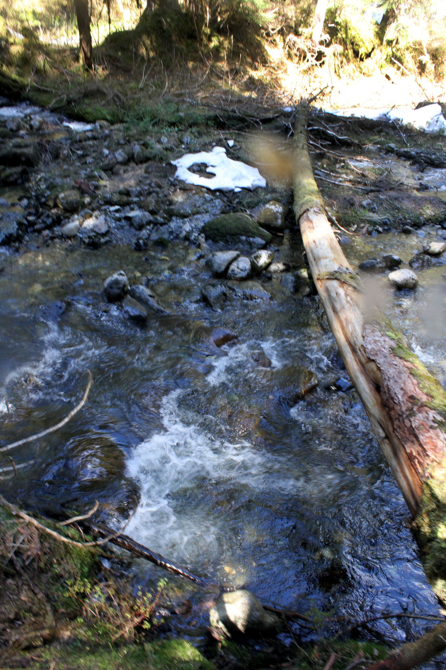 After the snow slowed us down and we were dropping in elevation, we meandered along the river for the rest of the way to Montana Creek. Well, maybe ‘meander’ is the wrong word. We skirted the steep hillside on the small goat trial and at one point we actually had to forge the river because the trees had fallen down the hillside and taken the land and trail with it. We had a 2 year old Rottweiler, an 8 year old Rottweiler / Akita, and Kiska. We didn’t feel that we could safely get across the trail ourselves, let along with the dogs. So we backtracked a little ways, and forged the river in a safe-er spot (no spot was really ‘safe’). For me, it was up to my butt cheeks, but luckily I was wearing my Under Armor shorts (they are kind of glorified underwear), so they didn’t get wet and my legs dried pretty quickly. But our boots were full of water.