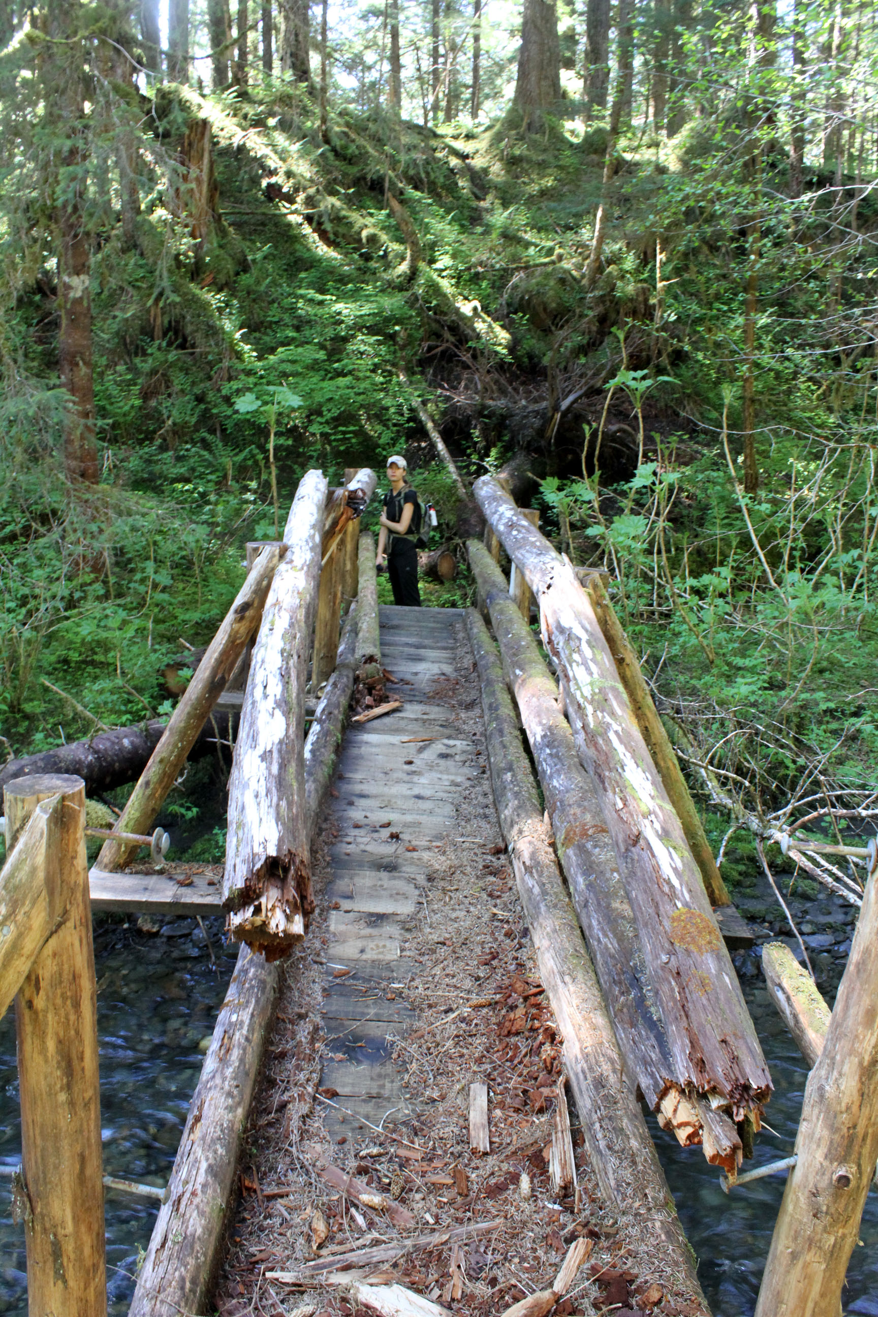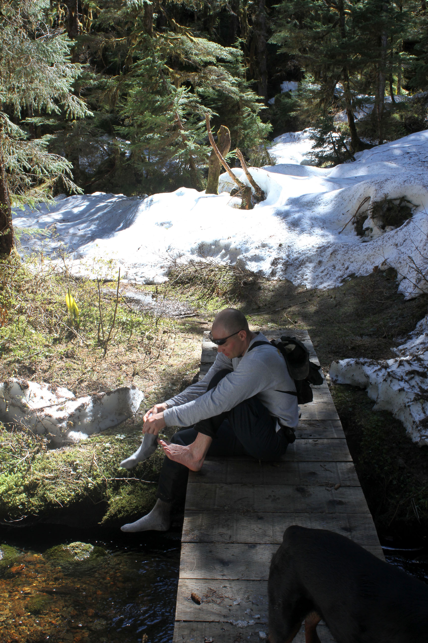 So, while post-holing, Carl got his feet wet. He was NOT a fan. There are a few bridges like this along the way.
