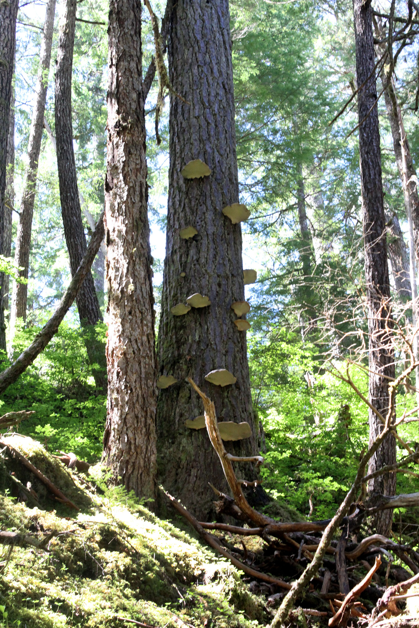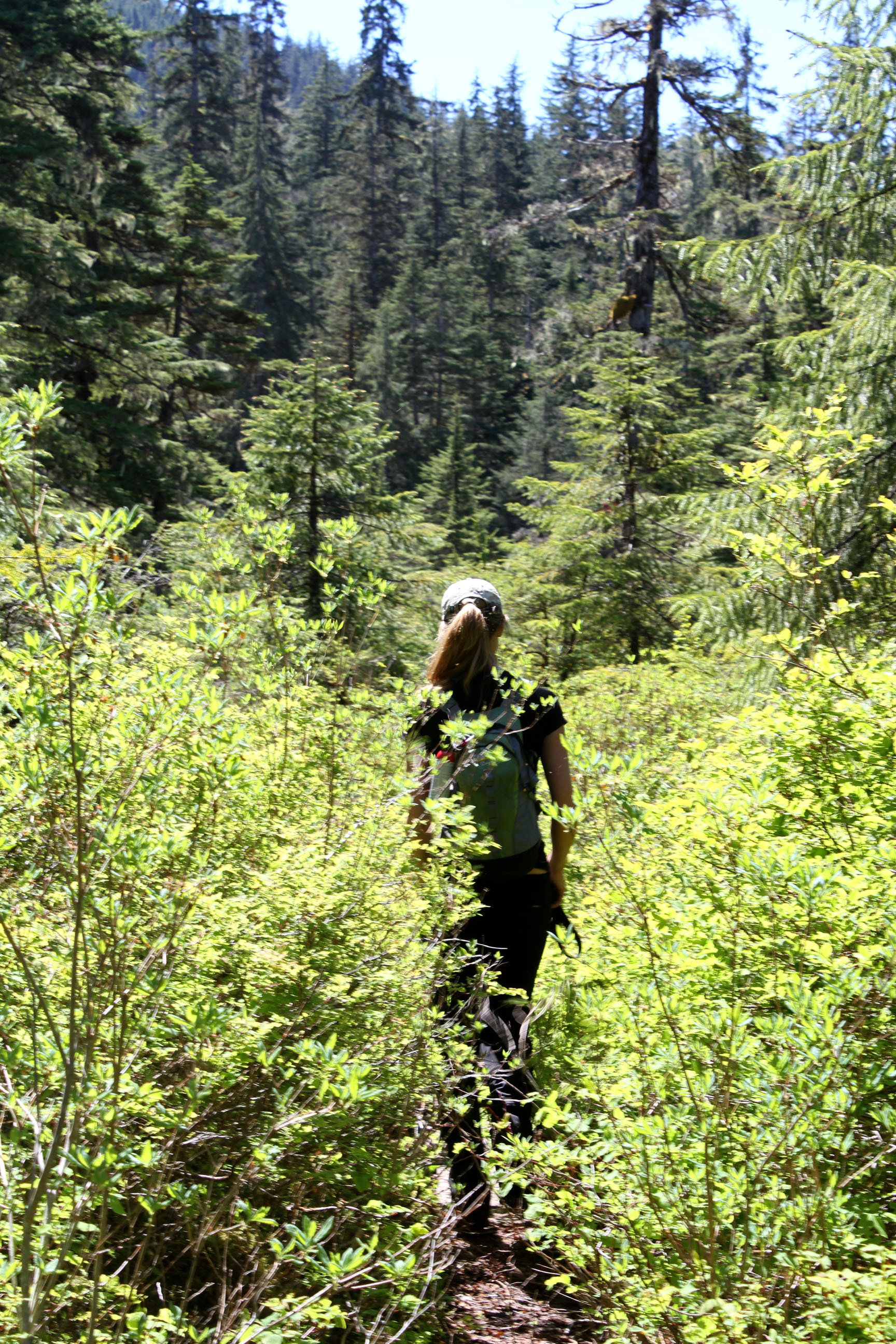 After we got through the bush-whacking, it went along a river and turned into an old-growth forest. The trail was less overgrown, and the bugs died way down. The trail went like this for a while, then we even went through a few small meadows. I found an old deer skull with antlers, but i’m not sure where the rest of the deer was. We didn’t see any wildlife in the meadows, though we did pause to look.