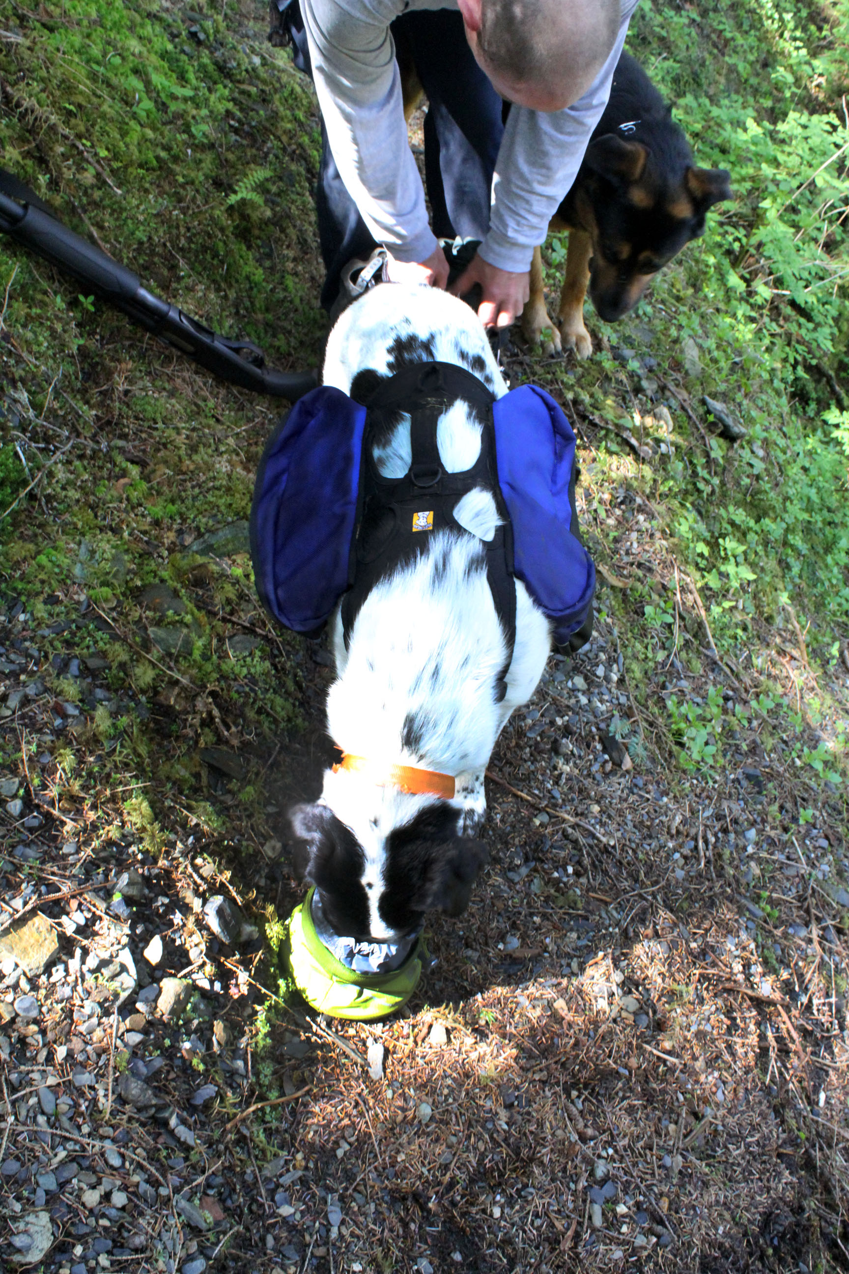 Kiska and her food bowl from REI Outlet. On longer hikes, please don’t forget that if you get hungry, your furry friend might be getting hungry too. And with the backpack, she carried her own food, water bowl, and a small 8oz water bottle just in case there wasn’t water along the way. Her backpack also has a handle at the top that we did use so we didn’t lose her down river. Also, at the end I clipped her bag to mine because she was pretty pooped, so the straps were helpful in doing that. Thanks Annie for the backpack!!!