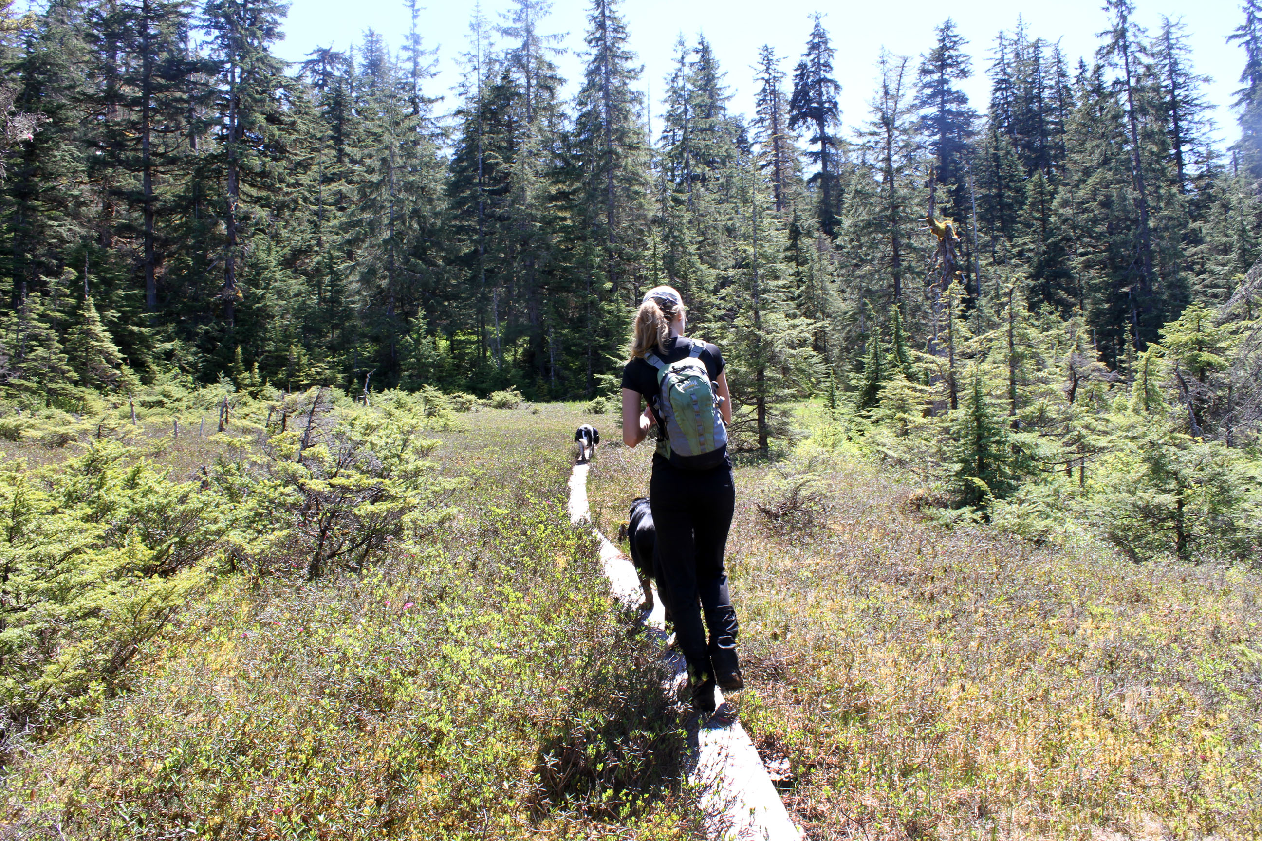 Shortly after you pass the cabin, there is a part of the trail where some rather large tress have fallen down and blocked the trail. We had to bush-whack around, and it took us a few to get back on the trial. This is where the bugs started to get bad. It was muskeg-ie and very wet. The vegetation is leaning in on the trail, so it was a little over grown. It was unfortunate for the person who went first, because the spider webs across the trail were numerous and unrelenting.