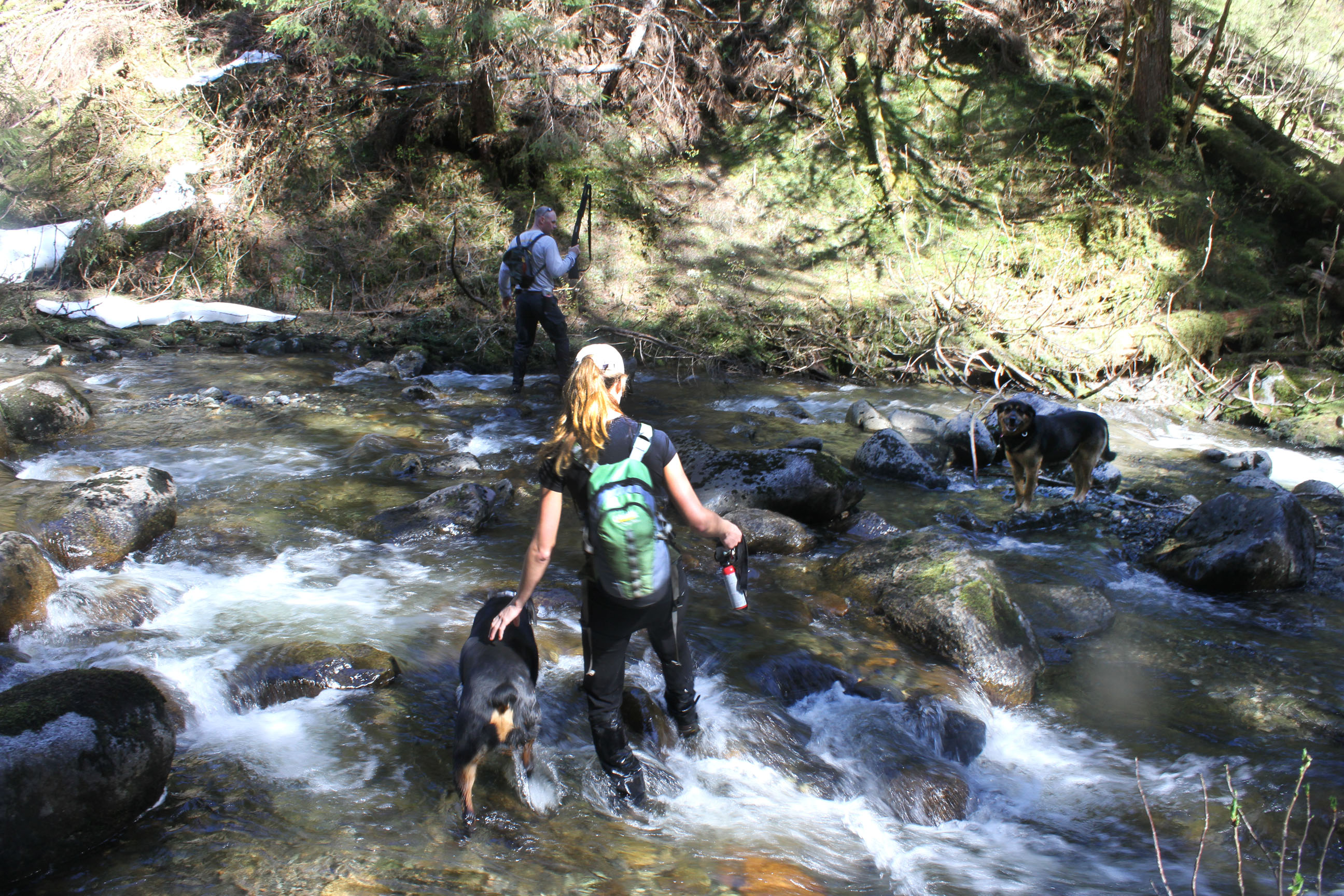 Second river crossing. You can see Carl almost to the other side, Teddy waiting for Annie in a shallow spot (Akita’s do not like water, poor Teddy), and Bruiser crossing with his mom Annie.