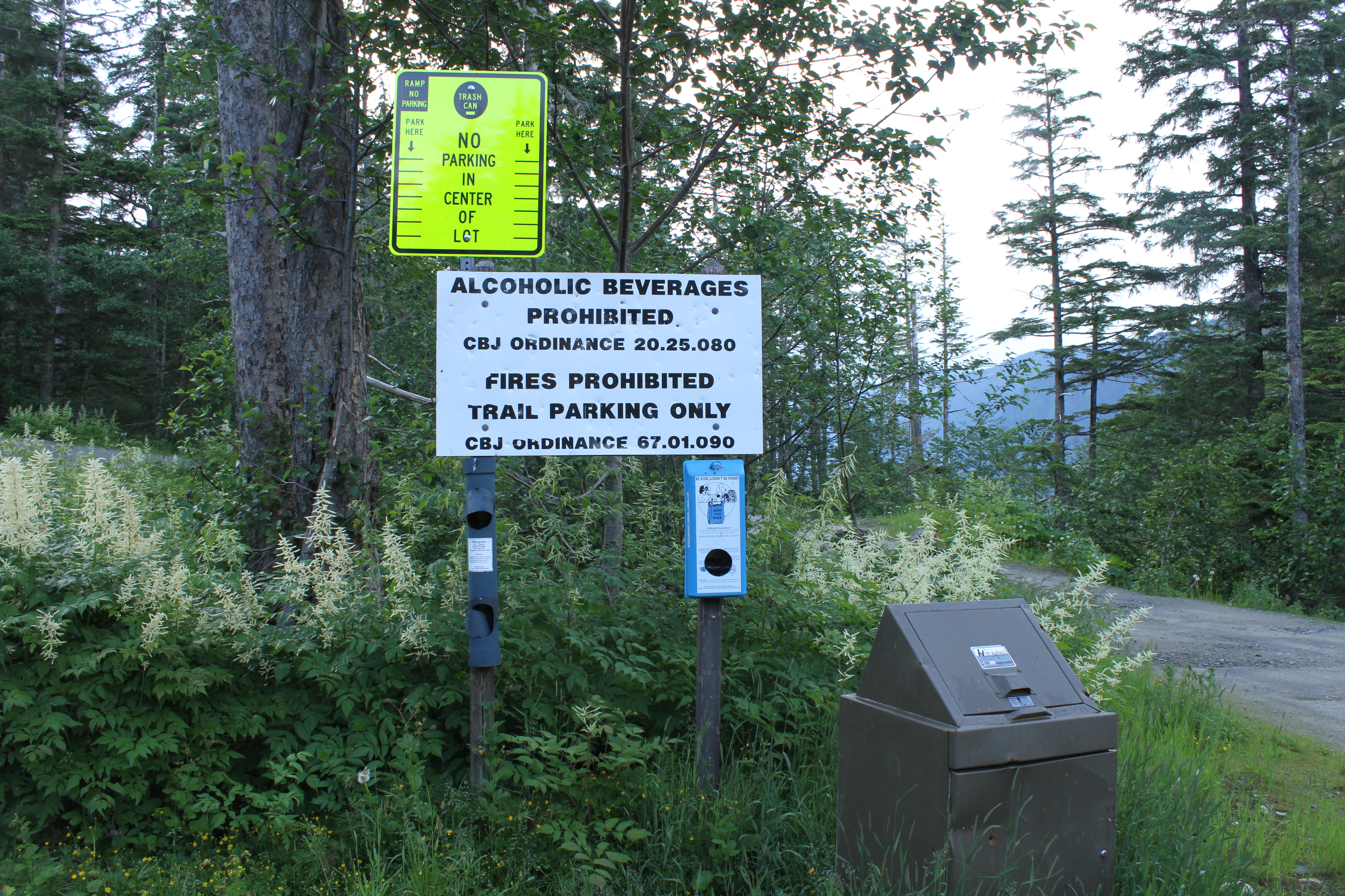 This trail does have an outhouse at the end of the trail, next to the cabin. This trail contains board walks, meadows, muskeges, stairs, and a cabin.