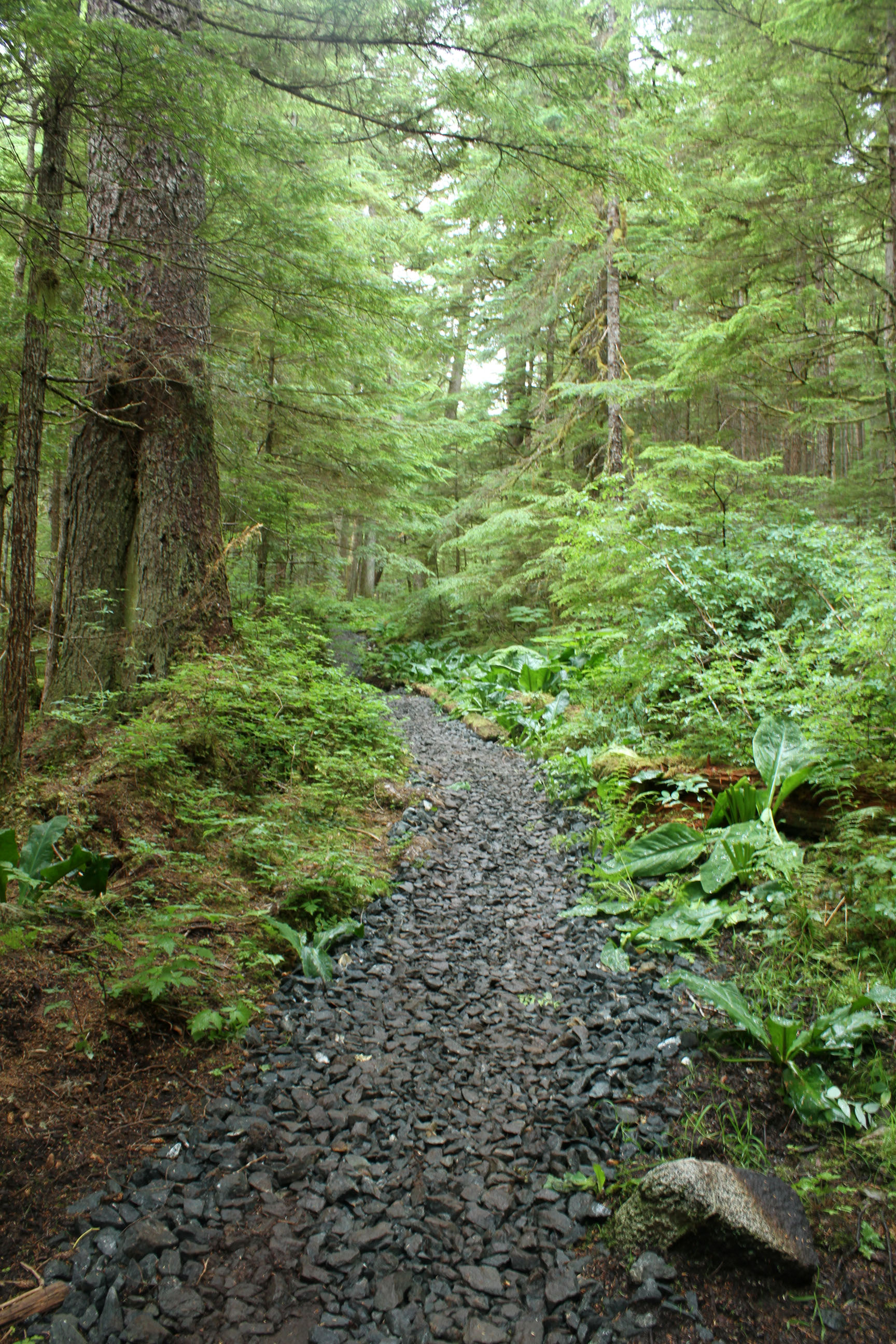 There is shot rock along the first bit, then some smaller gravel, then just dirt and board walk.