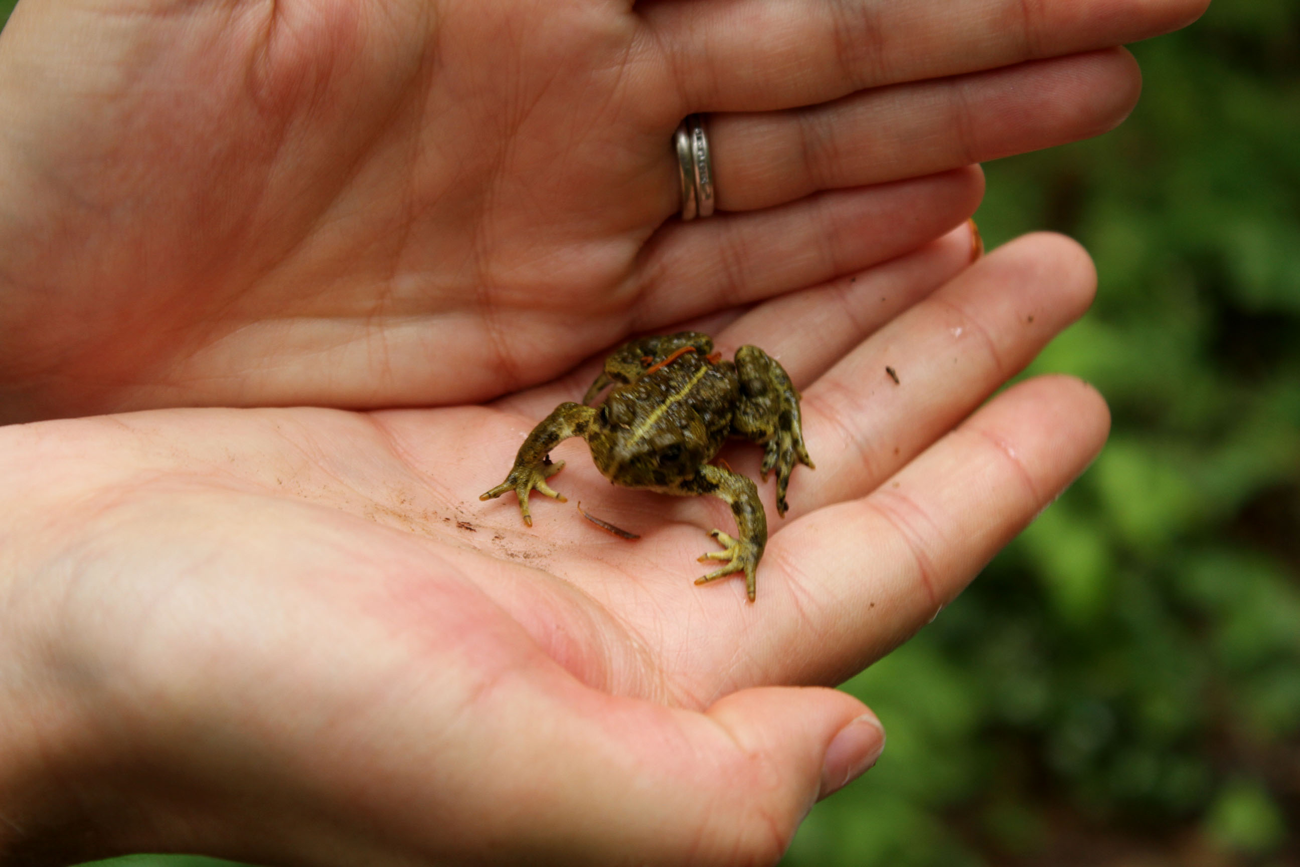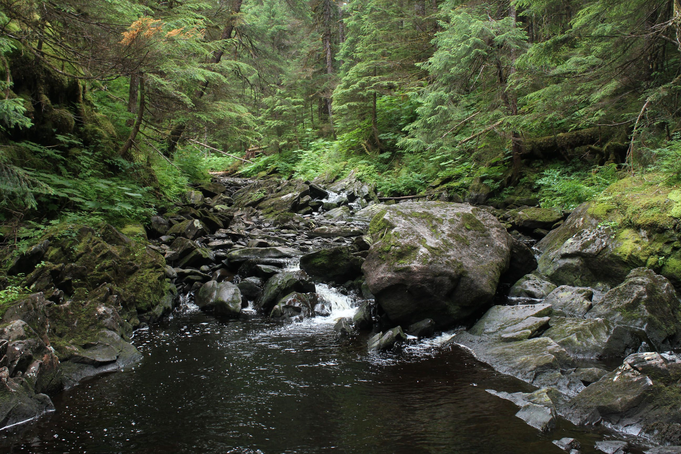 In the woods the trail is still pretty clear, but some of the dead skunk cabbage on the wood makes it pretty slick. So look out.